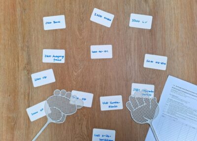 Gesagt, getan. Ich habe das Konzept leicht abgeändert, um es im Buchhaltungsunterricht Sek II einzusetzen. Herausgekommen ist ein Spiel, bei dem Teamgeist, Schnelligkeit und Buchungslogik gefragt sind.